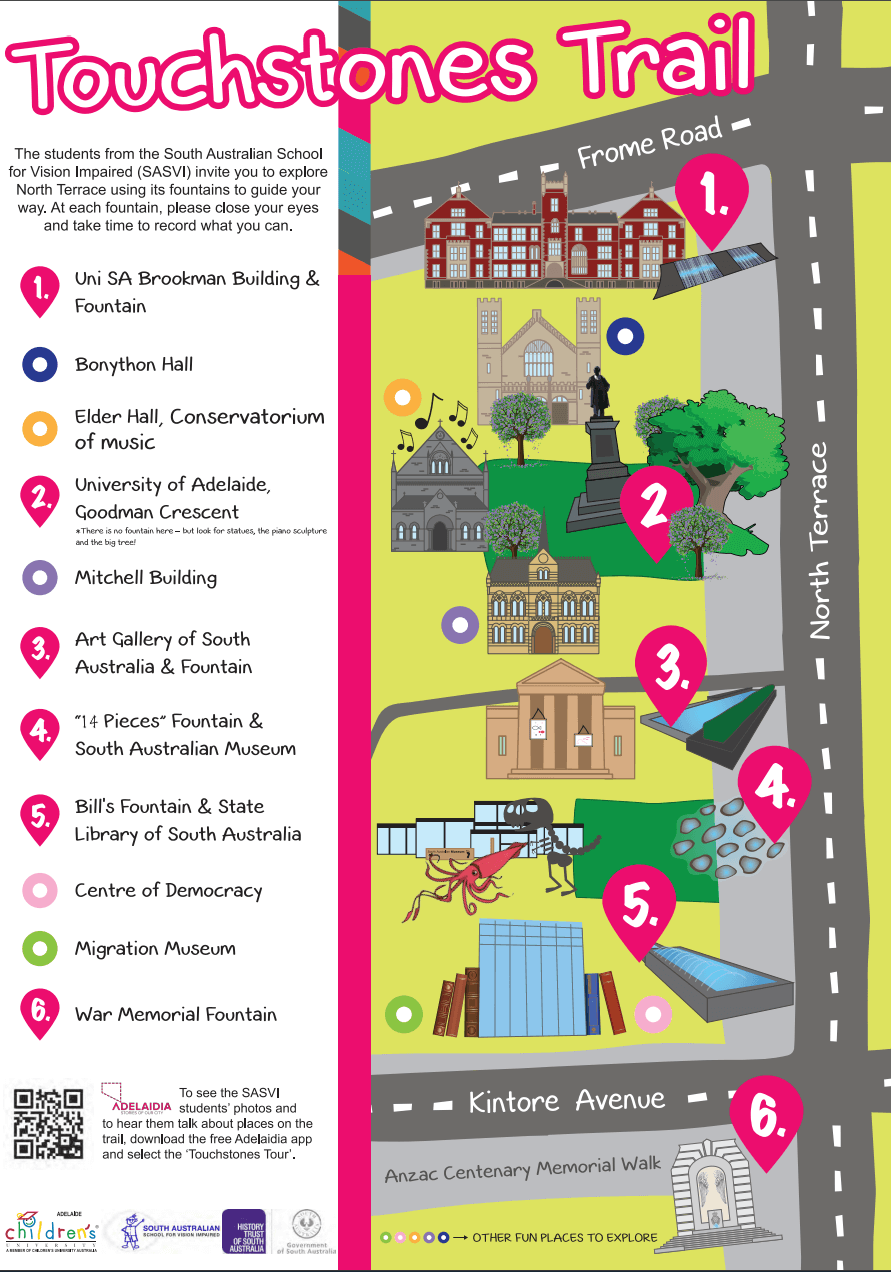 The resulting self-guided trail is downloadable and complemented with a special Adelaidia App which allows participants to listen to the sound recordings of the students from SASVI and view the photographs they have taken of the different locations Completion of the trail gains each CUA member 2 hours of learning in their passports.